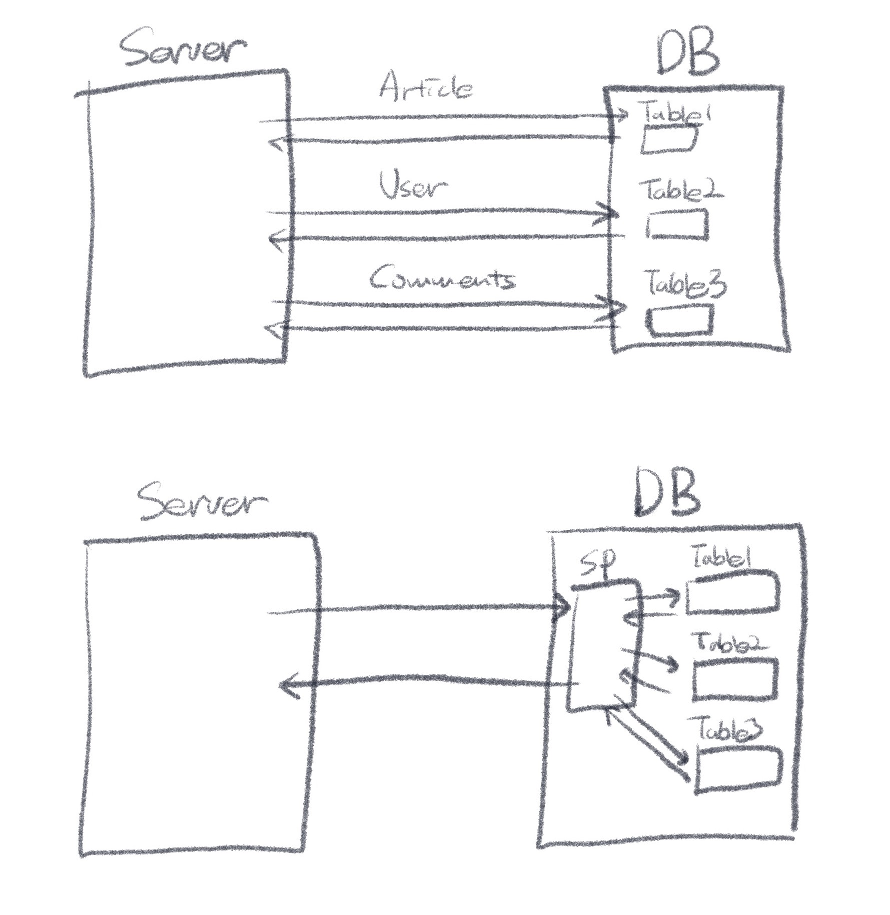 이 말인 즉슨, 서버에서는 SP를 호출하면서 파라미터를 넘기고 반환값을 받아서 사용한다. 그러니까 데이터베이스에서 파라미터를 잘 받아서 결과값만 잘 반환해주면, 데이터베이스 단에서 수정사항이 있는건 서버에서 그렇게 신경 쓸 것이 없다는 것이다.
