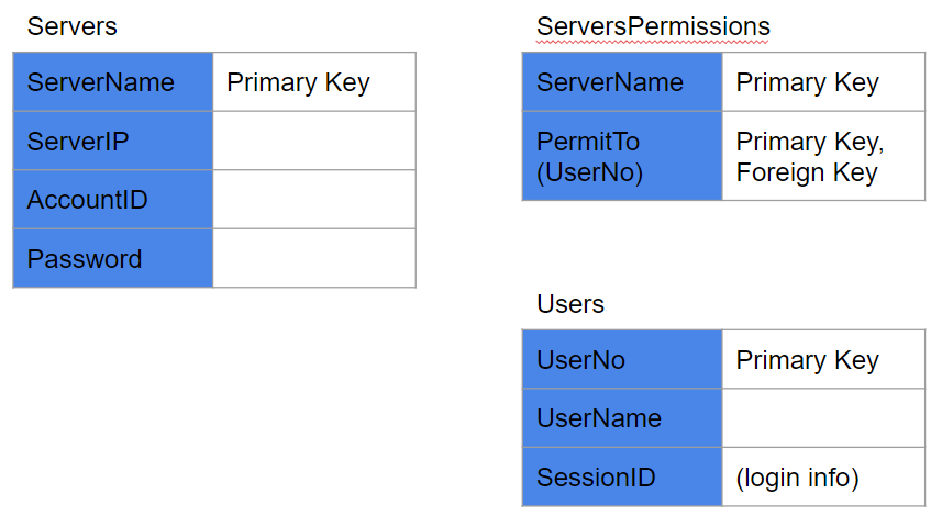 3. 하나의 Server에는 여러 users가 권한(Permission)을 가질 수 있다. 즉, ServersPermissions Table에는 하나의 serverName과 여러 User가 매칭된다는 것이다.