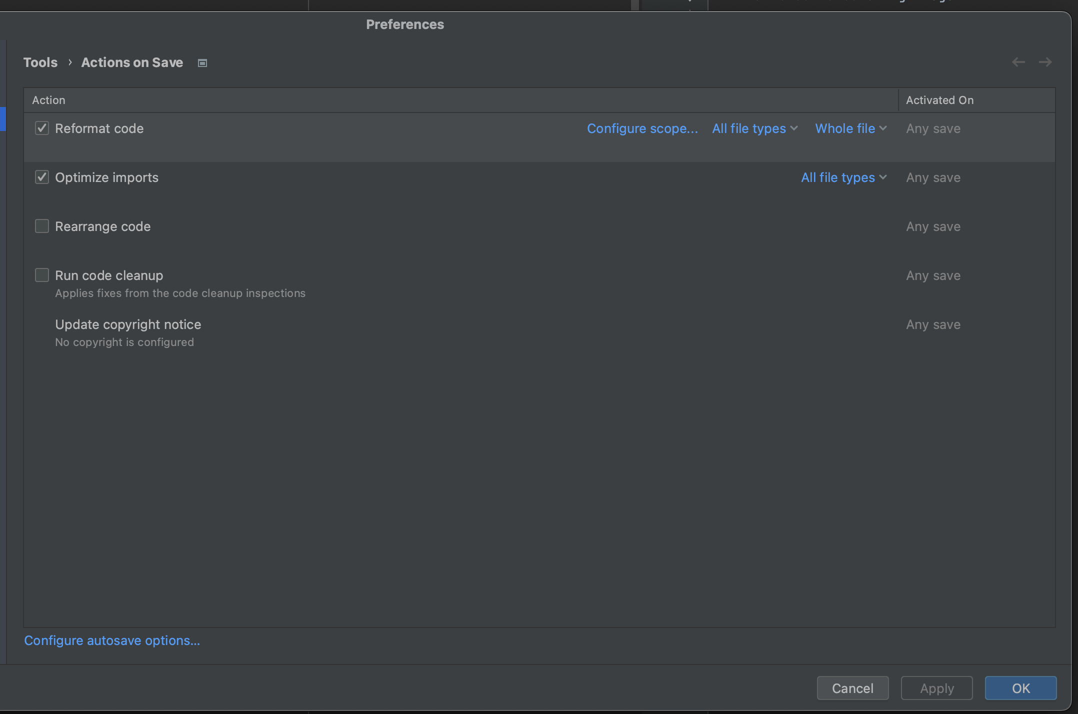 c. 여기서 위에 두 체크박스 reformat code 랑 optimize imports 를 활성화해줍니다.