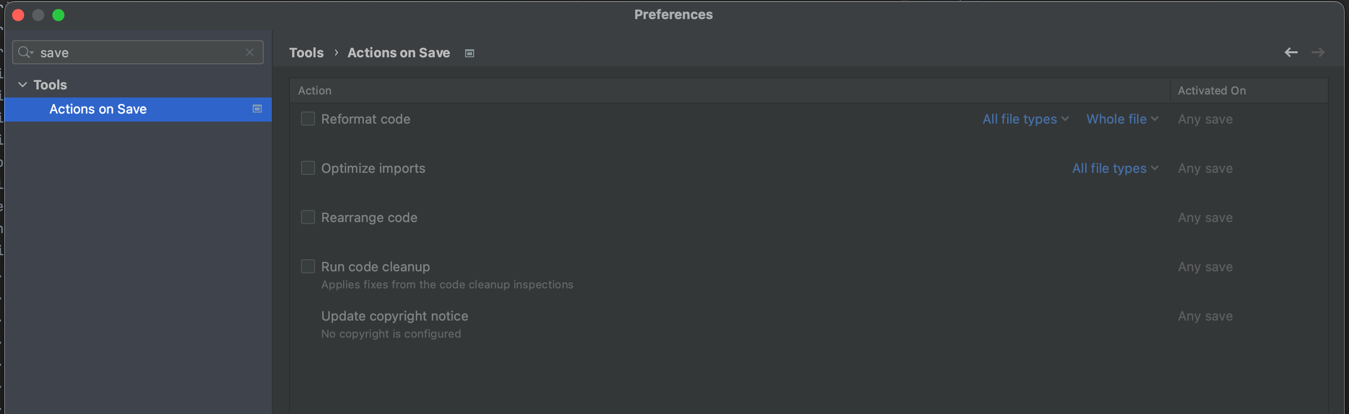 b. 검색창에 save 를 칩니다. 그럼 결과로 Actions on Save 라는 목록이 보이고, 아래와 같은 화면이 뜹니다.